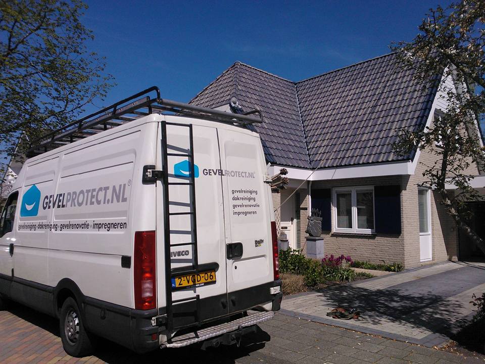 Eerst hebben we de dakpannen gereinigd met een van onze stoomunits. Met deze machines kunnen we water op de vereiste temperatuur, onder de gepaste hoge druk samen met een reinigingsmiddel op de pannen spuiten. Hierdoor weekt de vervuiling los en spoelt deze van het dak af.