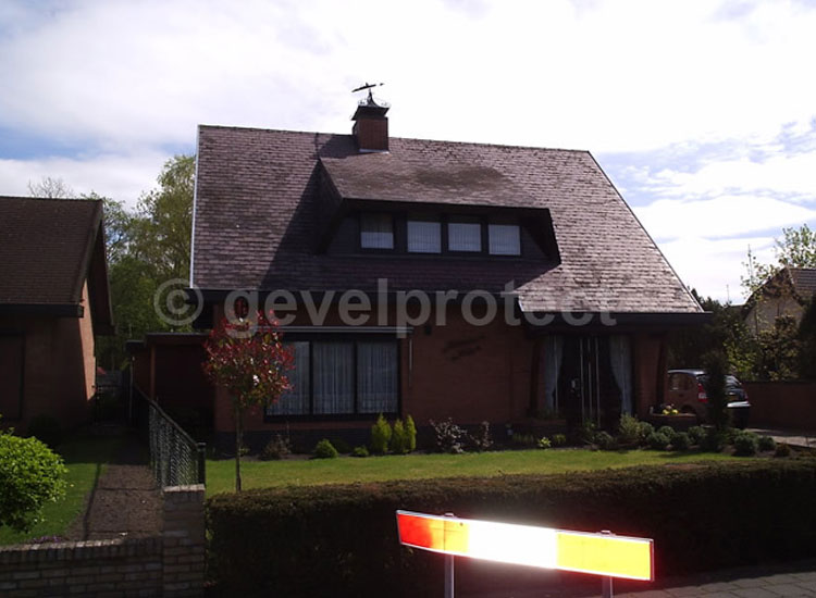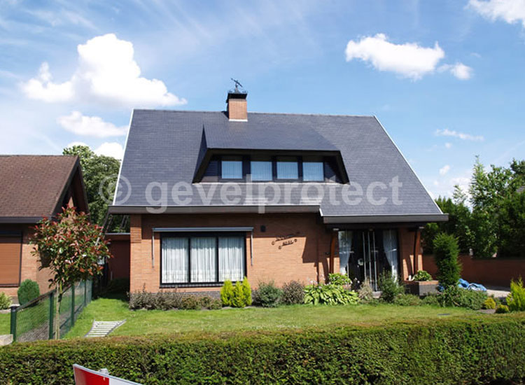 Eternit- lei is een kwetsbaar materiaal. Daarom hebben wij onder gepaste druk met heel heet water dit dak gereinigd. Na de behandeling met algendoder was het dak geschikt om te kunnen coaten. In 2 lagen hebben wij een antraciet- kleurige dakcoating aangebracht.