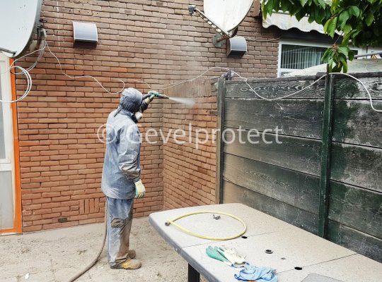 De gevels van de scheidingsmuren, bergingen en achtergevels worden door middel van torbo vochtstralen gereinigd en het voegwerk vervangen. De kapotte stenen en stenen waar stalen bouten in zitten worden in hun geheel vervangen.